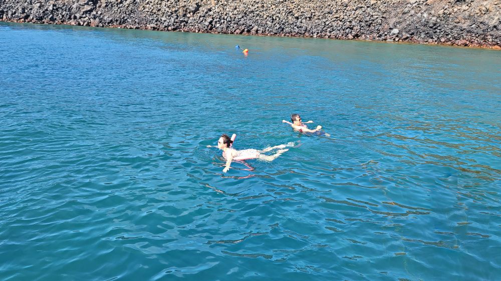 巡游的第二站是 圣托里尼火山,尼亚卡美尼岛(Nea Kameni),这里以其天然的温泉闻名。火山活动加热了海水,使得这一带的水域呈现温暖的橙黄色,富含矿物质。跳入温泉中游泳,体验温暖的海水带来的舒缓与治愈,感受火山岛独特的自然馈赠。