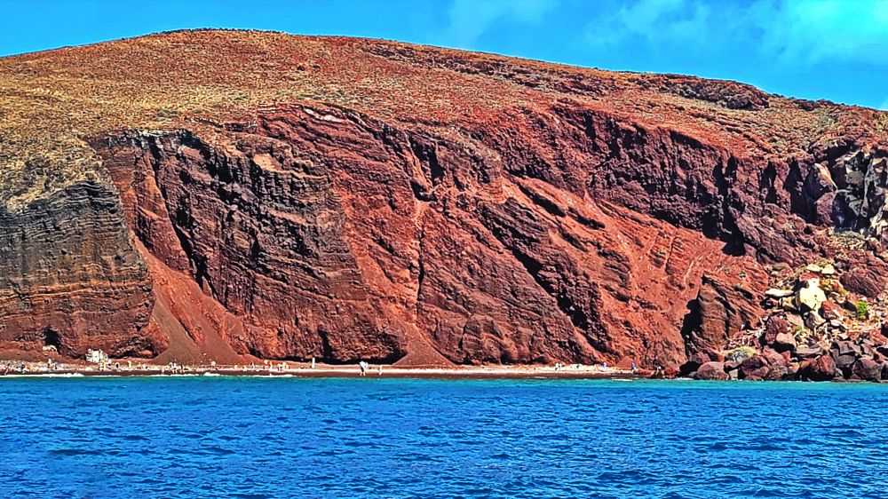 乘坐双体帆船环游圣托里尼岛是一场融合自然美景、美食与放松的奢华体验。从维查达(Vlychada) 码头 出发,第一站是以火山岩闻名的 红海滩,随后经过石灰岩层的白沙滩和原始的梅萨皮加迪亚海岸,欣赏圣托里尼独特的地貌与美景。