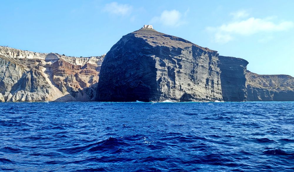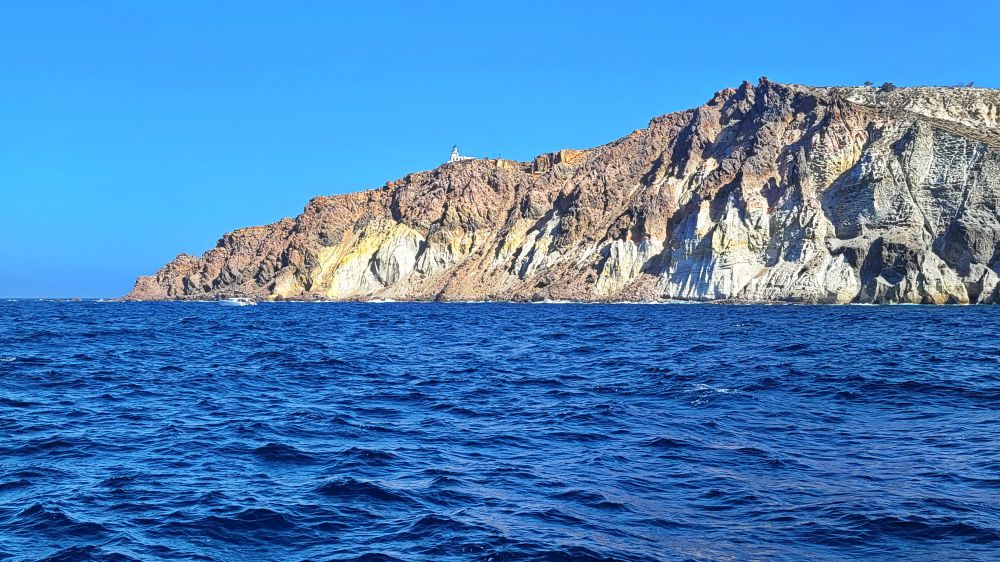 随后,帆船环绕火山岛继续航行,远处可见阿斯普罗尼西,圣托里尼五个火山岛之一最小的无人岛,名字在希腊语中意为“白岛”。