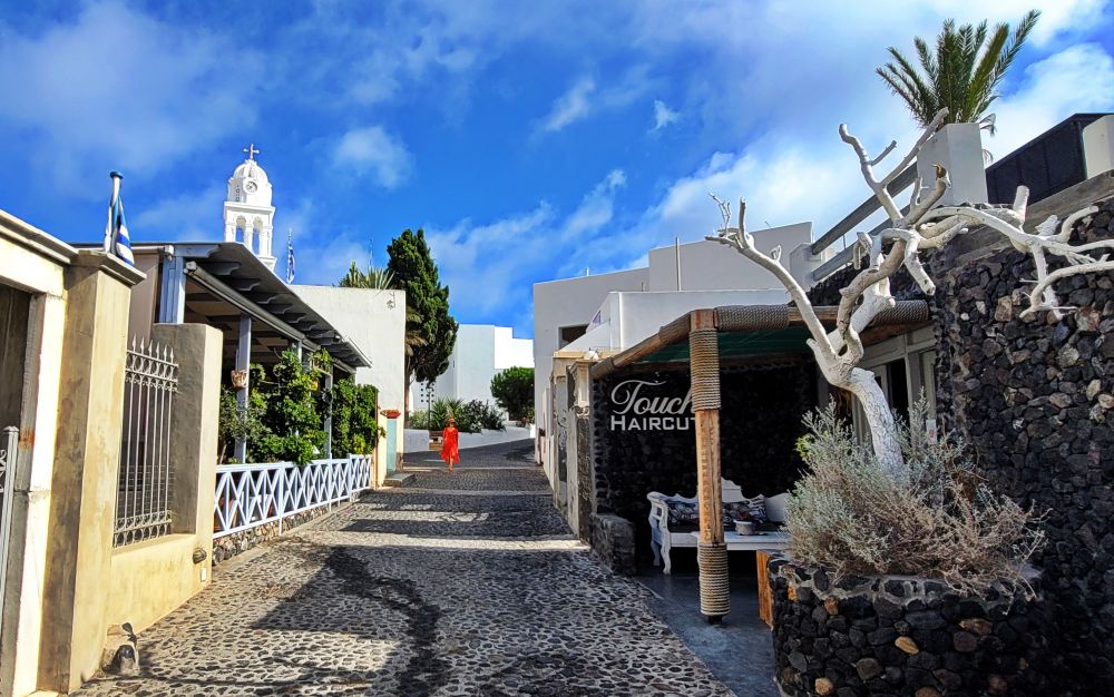圣母升天教堂(Eisodia tis Theotoku)位于村庄的中心,是圣托里尼岛上一座历史悠久且备受瞩目的东正教教堂。最显著的特征是带有时钟的白色雕花钟楼,是村民宗教生活的重要中心。洁白的外墙与教堂典型的蓝色圆顶相得益彰,而细致的石雕和拱门设计增添了庄严与美感。教堂周围环绕着宁静的小巷和传统房屋,与村庄的整体风格融为一体。