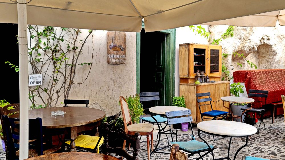 梅加洛丘里的中心是一个迷人的广场,广场周围点缀着传统咖啡馆和餐厅。这里的白色立面房屋与周围的葡萄园交相辉映,展现出圣托里尼岛最地道的一面。过去,村庄因盛产葡萄酒而闻名,酒桶经常通过小巷运往港口,是圣托里尼酒文化的核心地区之一。我们还参观了位于梅加洛丘里附近的卡纳瓦圣托里尼酿酒厂(Canava Santorini Winery),酿酒厂以其经典的火山岩地下酒窖和传统的酿酒工艺闻名。品酒体验是参观的亮点,我们品尝了Assyrtiko白葡萄酒的清新高酸、花香浓郁的混酿,以及醇厚甜美的Vinsanto甜酒。