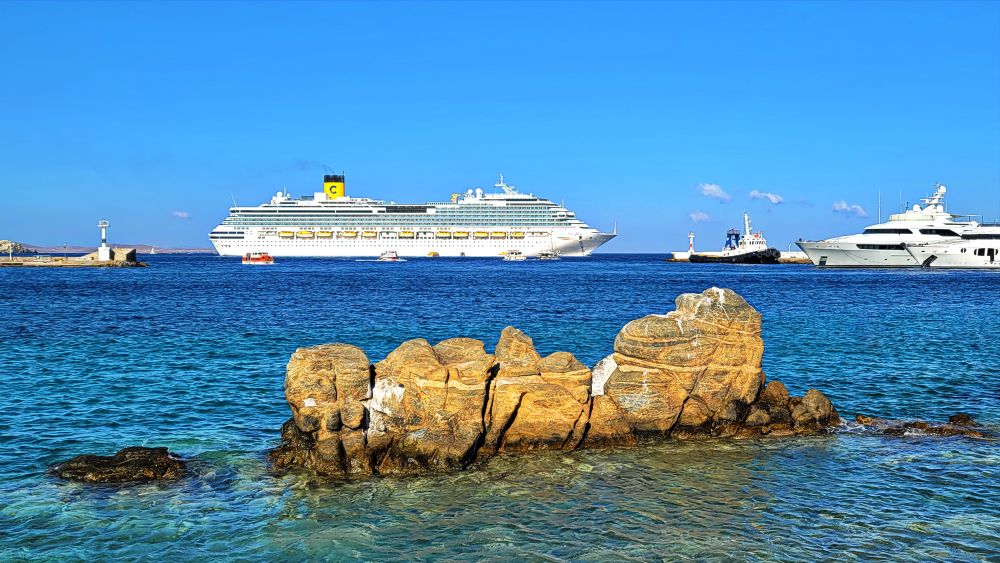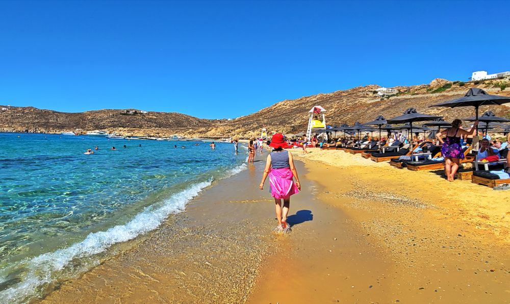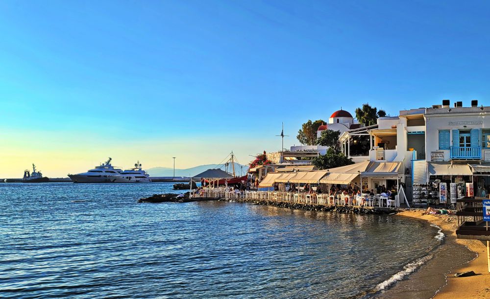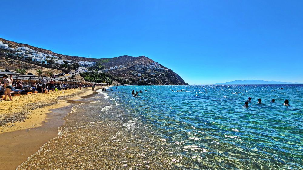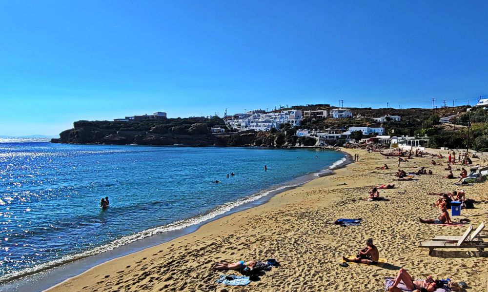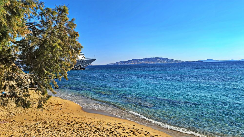 位于米科诺斯新港附近,是一个宁静而迷人的滨海之地。相比岛上的其他繁华海滩,这里显得更加低调,适合追求安静的游客。海滩的沙质柔软,海水清澈见底,远处停泊的游艇为景色增添了一抹优雅的点缀。这里的位置临近新港,是观赏日落和游船的理想地点,同时方便前往岛上的其他景点。