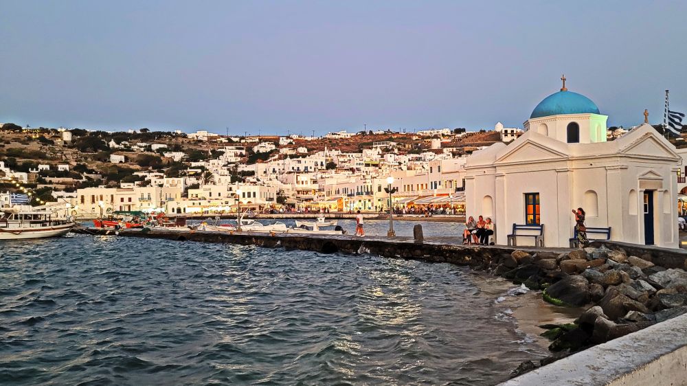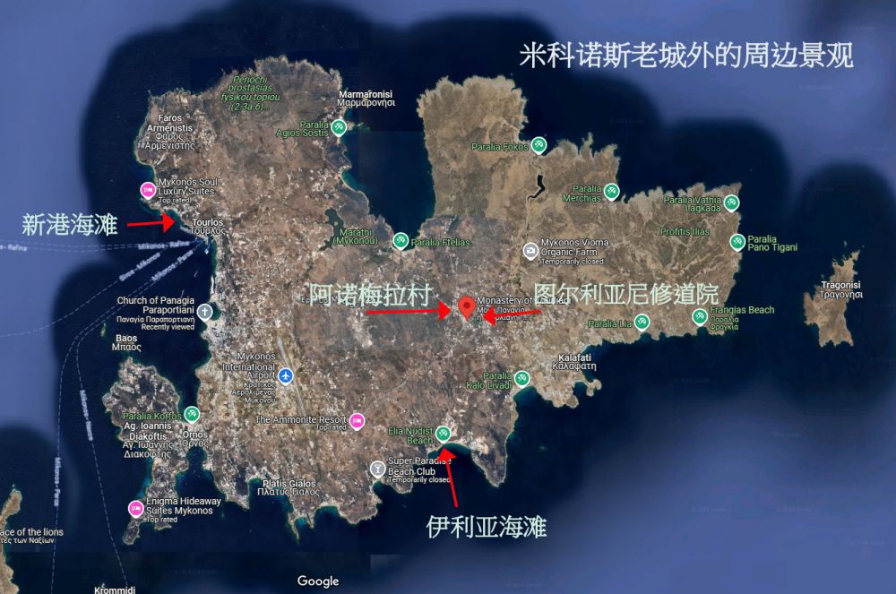 米科诺斯老城外的周边景色融合了自然与文化的独特魅力。沿着海岸,可以到达风车山丘,俯瞰老城与爱琴海,尤其在日落时分,景色格外迷人。