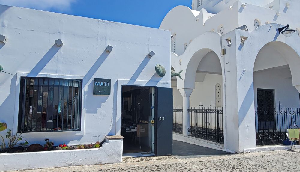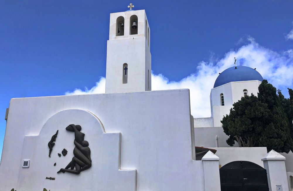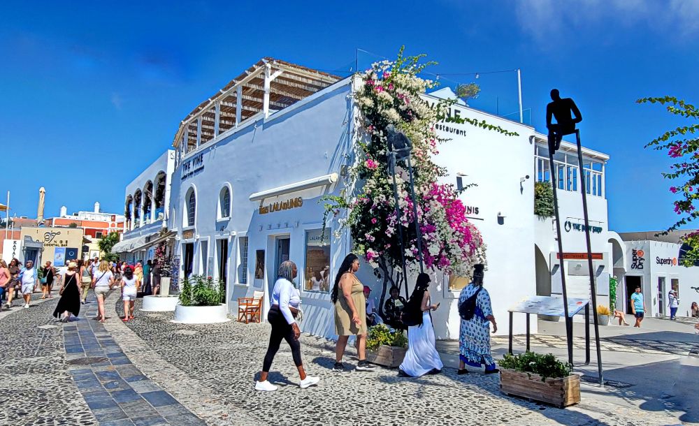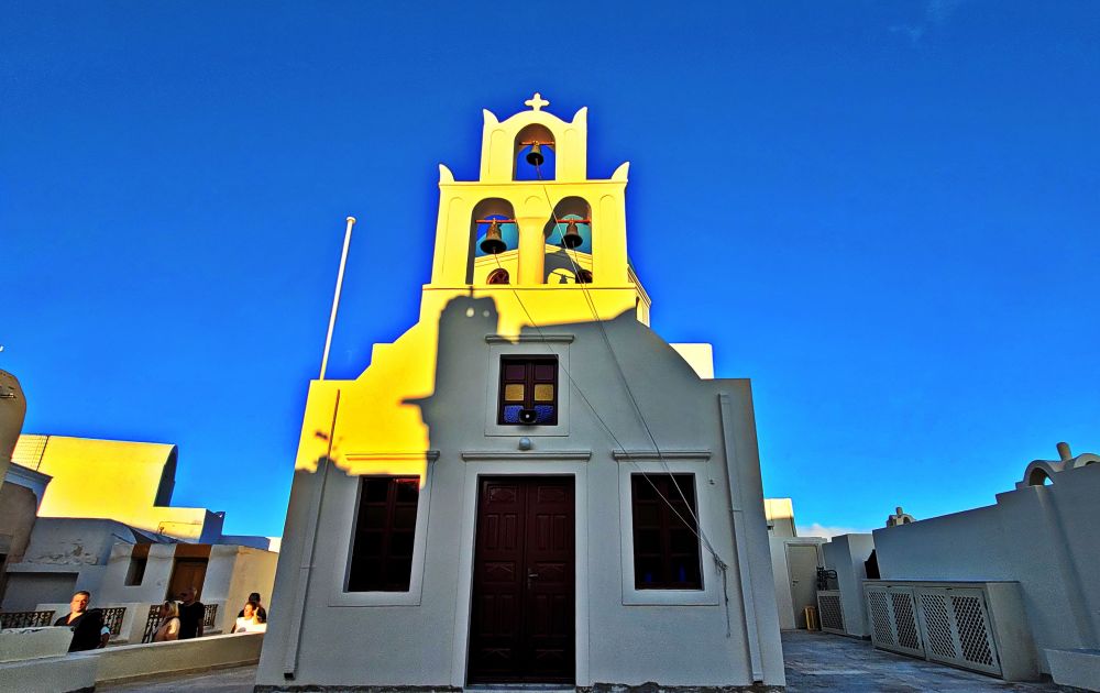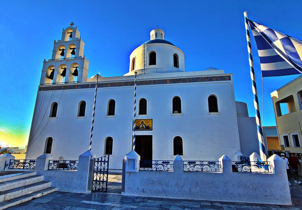 位于圣托里尼岛费拉(Fira)以北,是一个宁静而迷人的村庄,以其独特的悬崖景观和悠闲氛围吸引着游客。这里的名字意为“费拉的皇冠”,因其地势较高,可以俯瞰费拉和整个火山口(Caldera)的壮丽全景。村庄以其标志性的蓝顶教堂而闻名,蓝白相间的建筑群沿着悬崖分布,与湛蓝的爱琴海和火山岛相得益彰。这里的视野开阔,适合远眺帕莱亚卡美尼(Palea Kameni)和尼亚卡美尼(Nea Kameni)火山岛,以及锡拉西亚岛(Thirassia)的迷人风光。相比繁忙的费拉,菲罗斯特法尼更加静谧,非常适合享受悠闲的漫步或在悬崖边的餐厅中小憩。日落时分,这里的景色尤为迷人,金红的霞光洒在白色房屋和教堂上,营造出一幅如画的风景。
