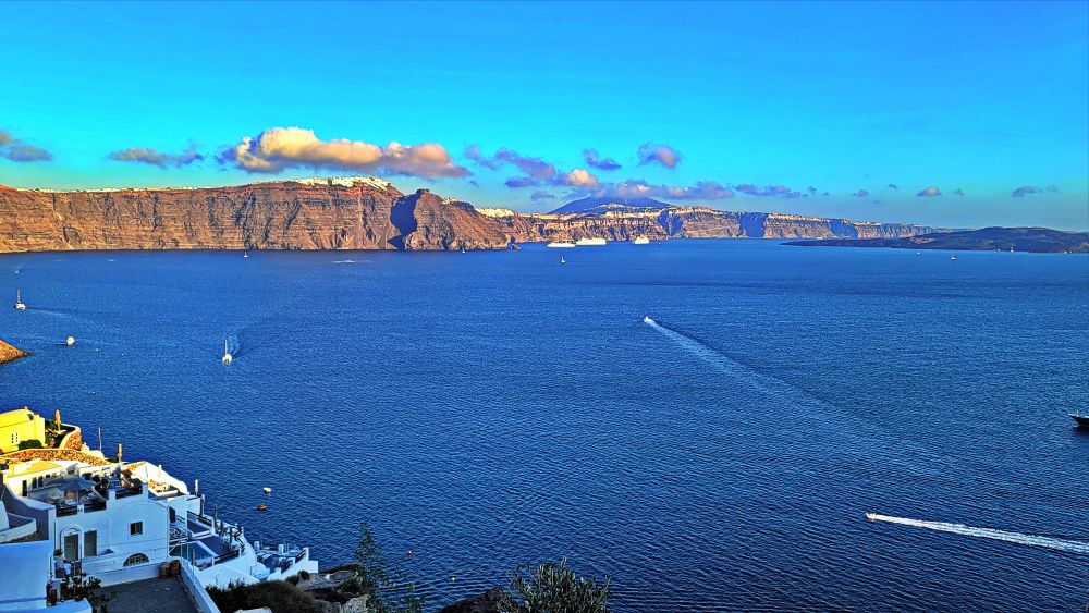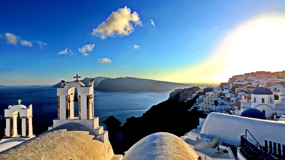 位于圣托里尼岛的最北端,是一个以迷人风景和浪漫氛围闻名的村庄。这里是圣托里尼岛上最具标志性的地方,拥有蓝顶教堂、白色立面房屋和风车,这些建筑沿着陡峭的悬崖分布,与深蓝的爱琴海交相辉映。伊亚的景色因其无与伦比的日落而享誉全球。当太阳缓缓落入地平线,天空被染成金色、橙色和粉色时,整个村庄笼罩在温暖的光芒中,宛如一幅画。最好的观景点是悬崖边的观景台和废弃的城堡遗址,每晚吸引着无数游客。除了日落,伊亚还以其迷宫般的小巷、艺术画廊和悬崖边的餐厅而闻名。这里的景色不仅展现了自然之美,也融入了希腊传统建筑的独特风格,充满诗意与浪漫,是圣托里尼岛最令人向往的地方之一。