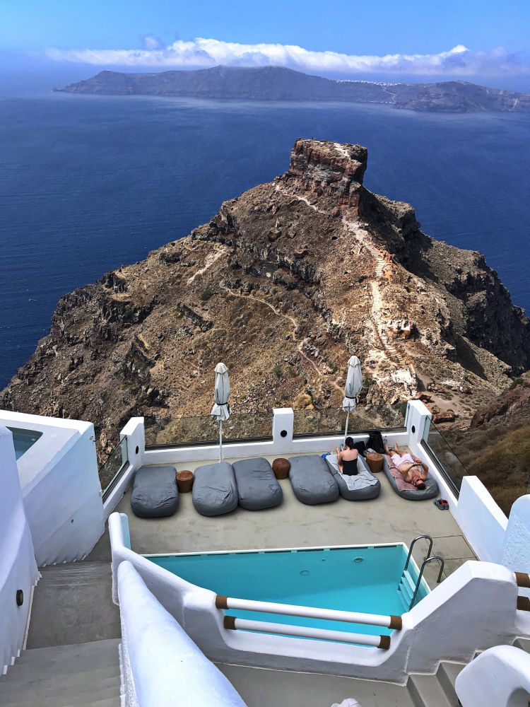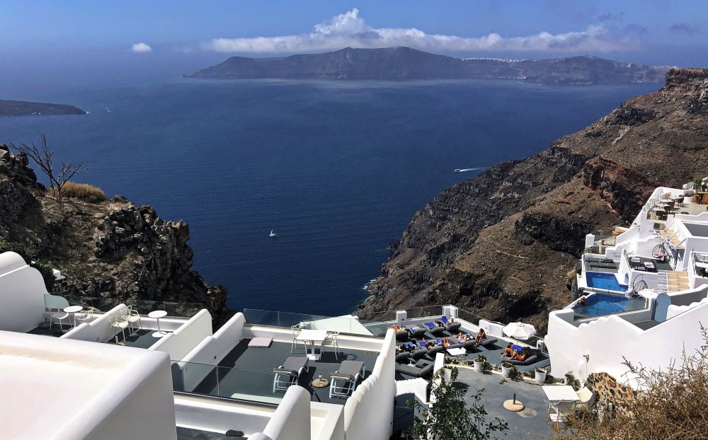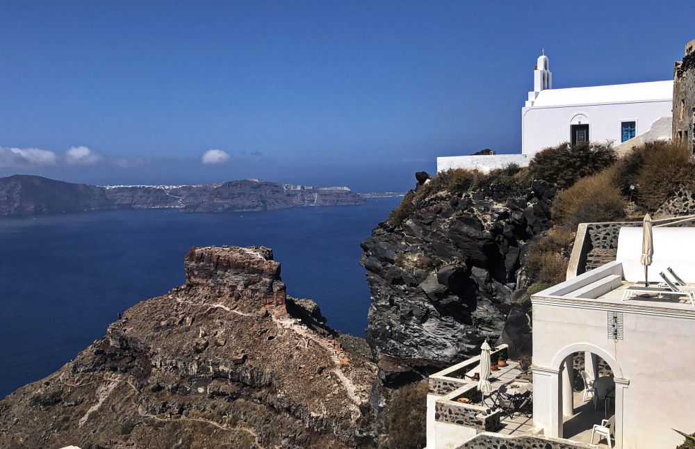 位于圣托里尼岛的火山悬崖最高处,被称为“悬崖之巅的村庄”,以其壮丽的景色和宁静的氛围闻名。这里提供了岛上最开阔的全景视野,能够俯瞰火山口(Caldera)、湛蓝的爱琴海以及周围的小岛,如帕莱亚卡美尼(Palea Kameni)和尼亚卡美尼(Nea Kameni)。伊梅洛维里的标志性景点是斯卡洛斯岩石(Skaros Rock),这是一座壮观的火山岩突起,曾是中世纪的堡垒所在地。岩石周围的步道让游客可以近距离欣赏其雄伟景色,绝对不容错过。