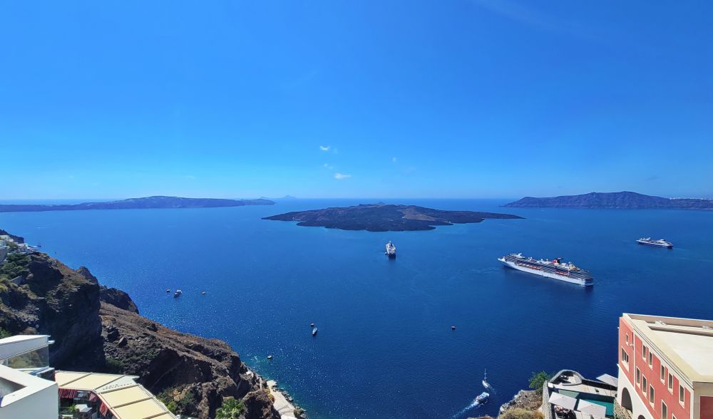 是圣托里尼岛的首府,坐落在陡峭的火山悬崖之上,俯瞰着湛蓝的爱琴海和壮丽的火山口(Caldera)。这里以蓝顶教堂、白色房屋和狭窄的石板路为标志性景观,建筑层叠错落,仿佛从悬崖中延伸而出,与蔚蓝的海天浑然一体,形成经典的爱琴海画面。站在费拉的观景点,可以一览帕莱亚卡美尼(Palea Kameni)和尼亚卡美尼(Nea Kameni)火山岛的壮丽景色。日落时分,金色的霞光洒在白色房屋上,火山口和海面被染成梦幻的色调,令人叹为观止。除了自然美景,费拉还有许多悬崖边的餐厅和酒吧,提供一边享用美食一边欣赏绝美风景的独特体验。