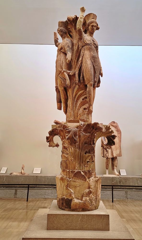 德尔斐舞者,又称莨苕柱,是阿波罗神庙附近发现的一根柱子的顶部雕像。这根柱子高约13米,顶部为莨苕叶饰柱头,上方延伸出柱杆,支撑三位高1.95米的女性雕像。她们身穿短束腰外衣,赤脚悬空,双臂高举,姿态如优雅的舞者,因此得名。