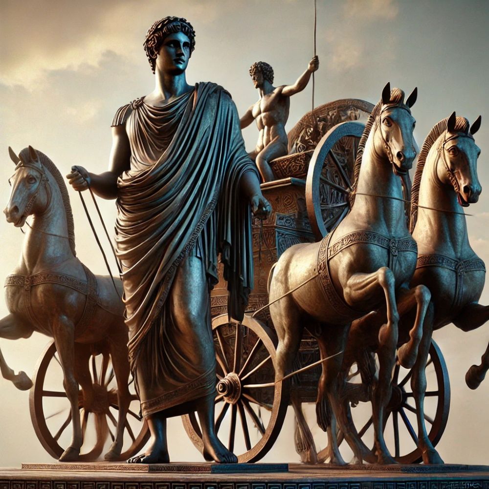 这是查里奥特铜雕(青铜战车御者)的AI复原图,展示了古希腊青铜雕塑的原貌,包括战车、缰绳和完整场景,