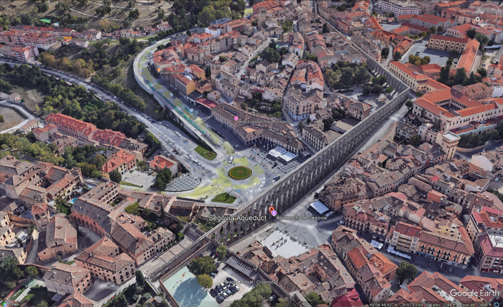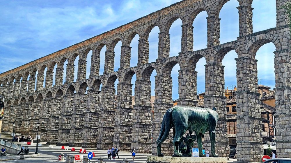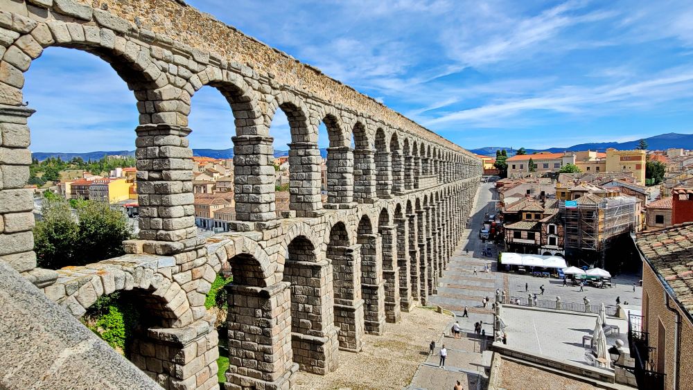 壮观的罗马渡槽是西班牙规模最大的古罗马遗迹之一,全长为894公尺,由163个拱形柱组合而成,结构没有任何水泥、钢钉,完全运用罗马人智慧与当时技术建造而成。可以说是公元一世纪最伟大的工程。水道桥引自周边山脉水源,经由市区抵达西边的阿卡乍堡。 塞哥维亚老城和罗马渡槽已被列入世界遗产名录。
