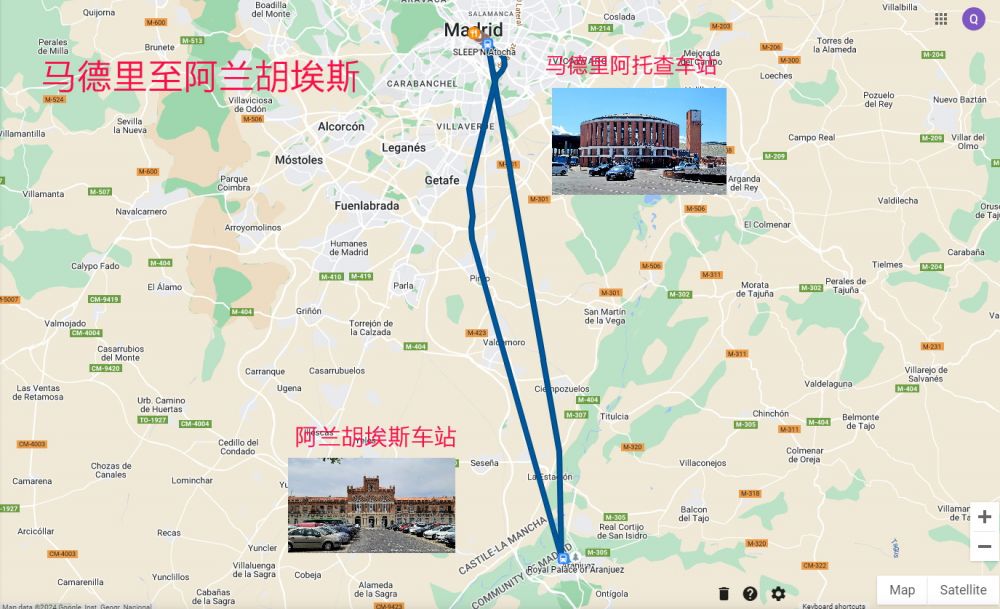 费利佩二世开始修建王宫和毗邻的纪念碑和花园,国王菲利佩五世将宫廷中心移到阿兰胡埃斯,卡洛斯三世和四世分别修建了王宫的两翼和“王子花园”以及“农夫之家”。因此,整个王宫呈现出多种不同的风格。阿兰胡埃斯属于马德里大区,距离马德里50公里。建议搭乘火车,从马德里阿托查车站到阿兰胡埃斯的C3列车仅需44分钟,运行频繁。阿兰胡埃斯宫距离火车站还有10分钟的步行路程。