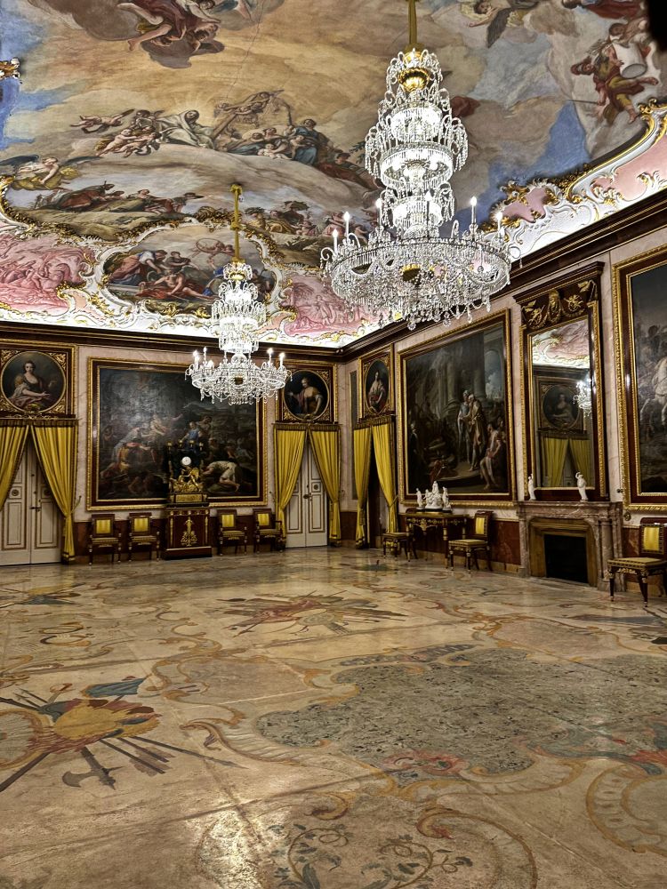 女王的警卫室。它装饰有卢卡·焦尔达诺 (Luca Giordano) 的画作、橄榄色和青铜色家具以及查理四世的地图集