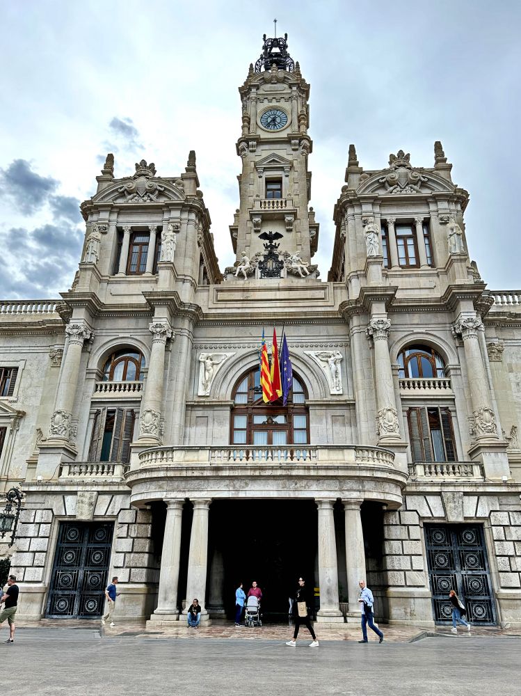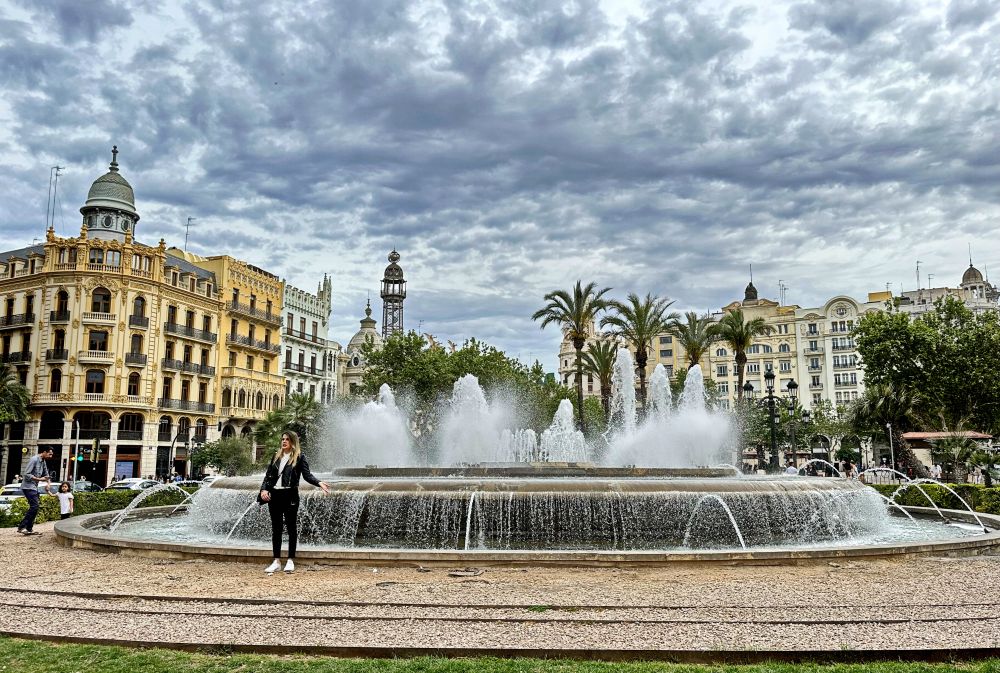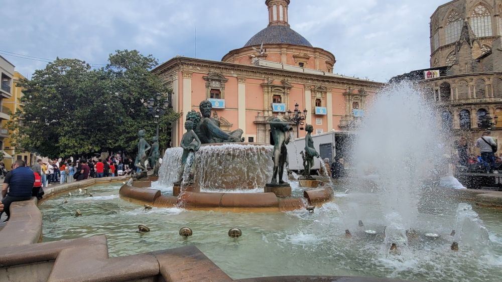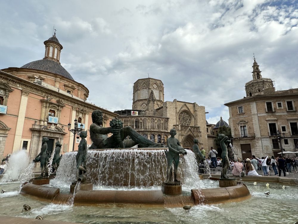 圣女广场是瓦伦西亚老城的地标建筑,广场中央矗立着著名的图利亚河喷泉雕塑,中间高起的台子上半躺半坐着一位男性雕像,周围若干仙女姿态各异,或举或抱着水罐,源源不断涌出的清流,激起朵朵水花,颇为生动壮观。