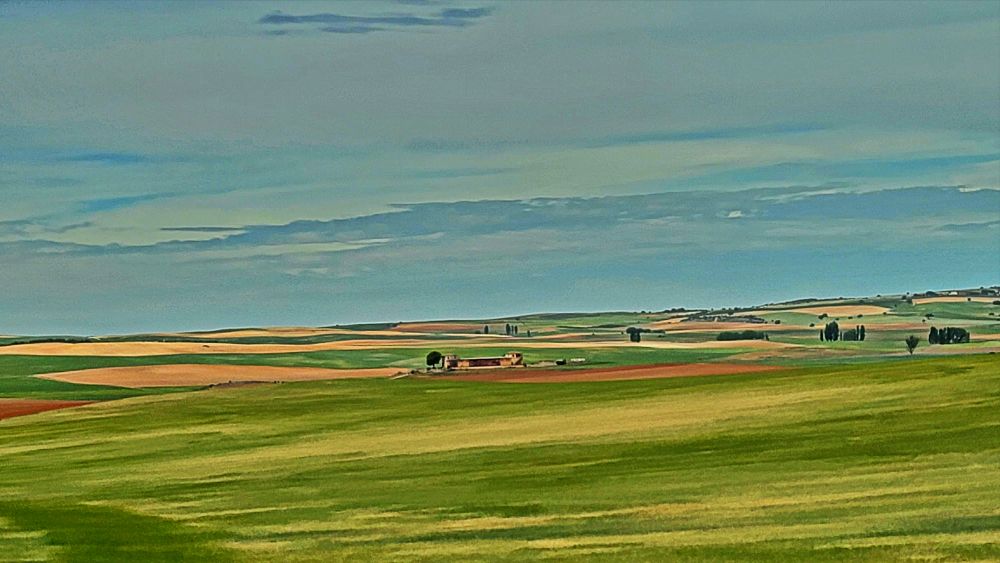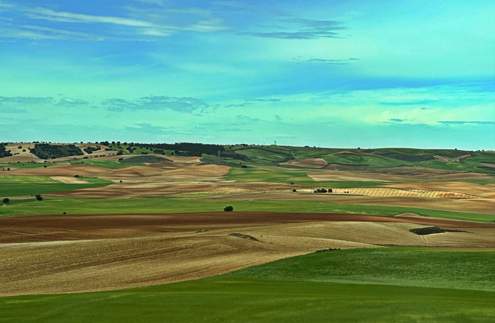 离开马德里,逐渐远离城市,周围景观变得更为开阔,广袤的平原延展,尤其是在夏季,田野被晒得一片金黄,给人宁静的感觉。随着汽车驶入卡斯蒂利亚-拉曼恰(Castilla-La Mancha),这片地区以广袤的田园景色著称。道路两侧是连绵的橄榄树、葡萄园、麦田和向日葵田。在这里,景色的基调以温暖的金黄色和深绿色为主,展现了西班牙农村的典型画面。