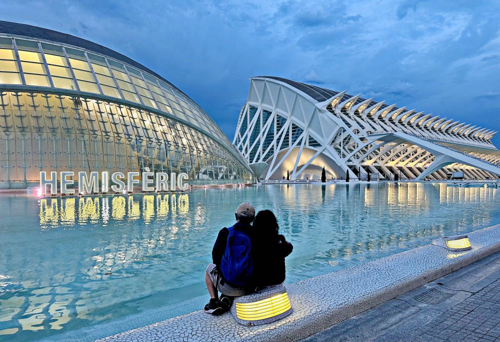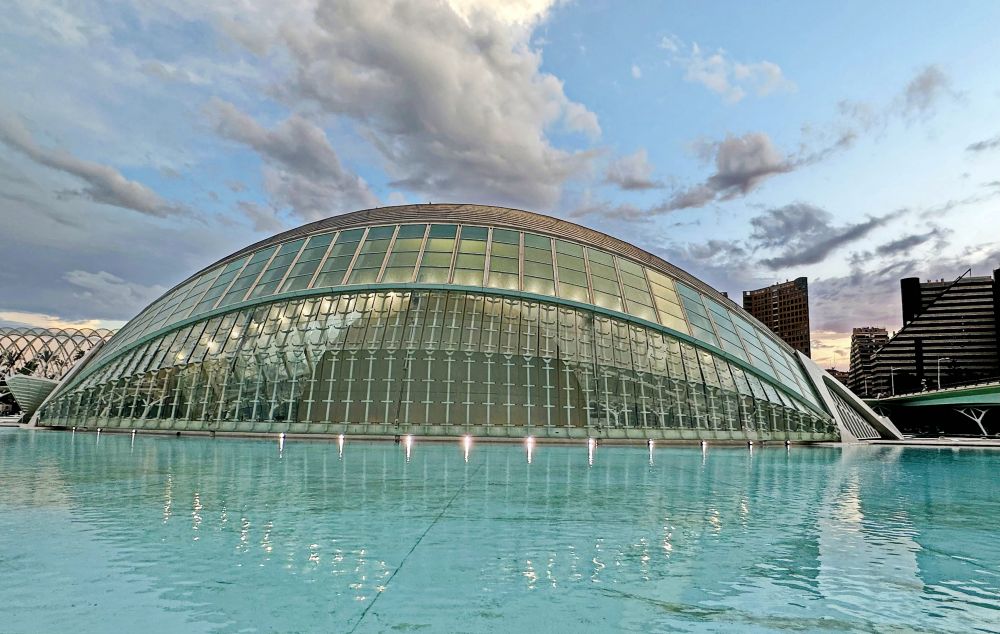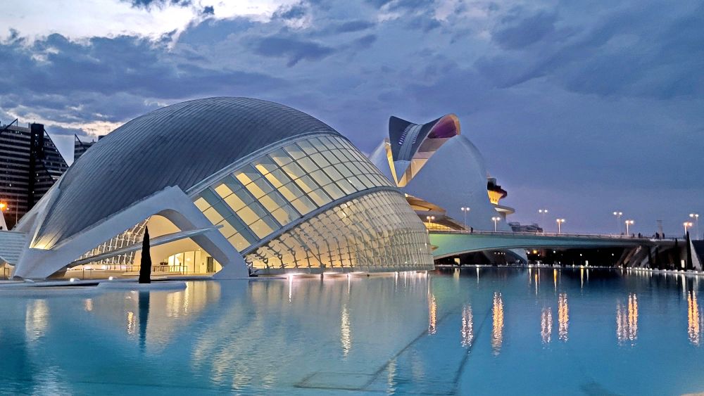 瓦伦西亚的艺术科学城是一座集现代建筑、文化与科技于一体的标志性建筑群,位于瓦伦西亚市东部的图里亚河床公园(Jardín del Turia)中。这座建筑群由著名的西班牙建筑师圣地亚哥·卡拉特拉瓦(Santiago Calatrava)设计,是当代建筑的杰作,也是西班牙最具代表性的现代化文化设施之一。建筑群沿着原来的图里亚河床依次排列,结构线条流畅,材质多为白色钢材和玻璃,显得轻盈又富有动态感。广场、人工水池和绿地围绕在建筑周围,增添了宁静和谐的气氛。艺术科学城的建筑布局巧妙地结合了自然与人工元素,大面积的水池和绿地围绕着建筑群,水面上的倒影与建筑本身相映成趣,给人一种超现实的感觉。夜晚,整个建筑群灯火辉煌,建筑物倒映在平静的水面上,营造出梦幻般的氛围。