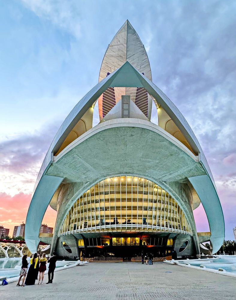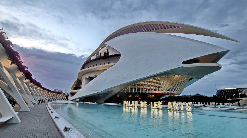 作为歌剧院和音乐厅,艺术皇宫的设计充满动态感,外形像一艘宇宙飞船或巨大的白色贝壳,顶部由细长的钢结构覆盖,给人一种悬浮感。这里是瓦伦西亚艺术文化的核心地带,举办各种音乐会、歌剧和戏剧表演。