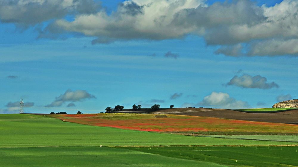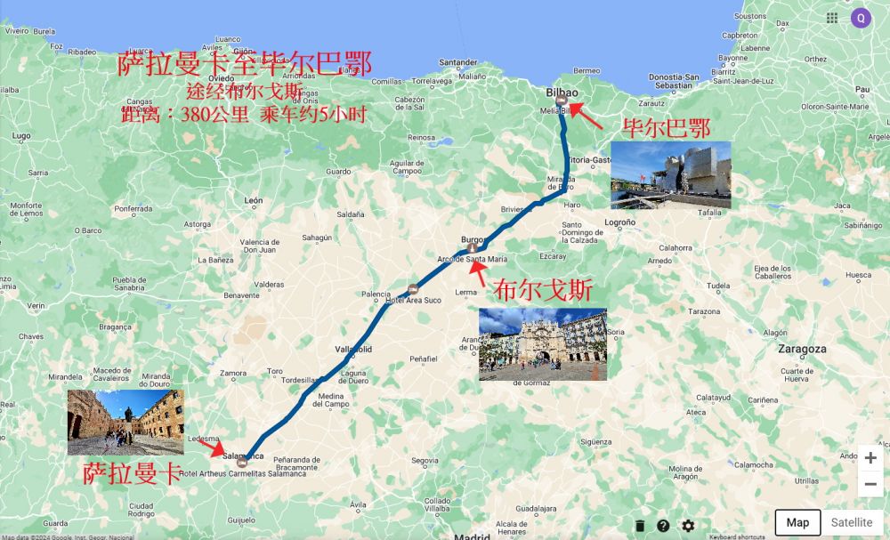 从萨拉曼卡到布尔戈斯,大约需要三小时的车程。这一路途中的景色非常多样,主要呈现出西班牙中部的乡村风光。萨拉曼卡附近是一片广阔的平原,田地颜色各异,时而金黄,时而翠绿,一望无际,非常壮观。接近布尔戈斯时,地势再次升高,进入高原地区。这里植被茂密,常见松树林和橡树林,还有一些河流蜿蜒流过。