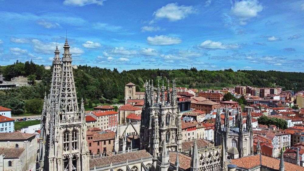 从航拍视角看到的布尔戈斯大教堂壮丽而宏伟。教堂以其精美的哥特式尖顶和复杂的石雕立面而著称,细致的建筑细节在阳光的照射下熠熠生辉。教堂的尖塔高耸入云,与蓝天相映成趣,显得格外庄严。周围是布尔戈斯市的历史街区,排列着带有红色陶瓦屋顶的老建筑,狭窄的街道交错穿梭,散发着古老的欧洲风情。教堂附近还能看到绿色的公园和林荫道,为这座古老的城市增添了一抹清新。远处,西班牙乡村的起伏山丘与广阔的田野延展到视野的尽头,形成了一幅迷人的自然画卷,凸显出教堂在整个景观中的地标性地位。