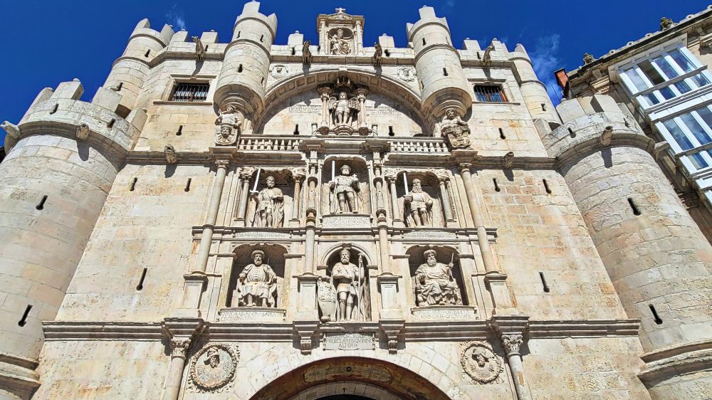 拱门的正面排列着许多雕像,展示了布尔戈斯历史上的重要人物,包括西班牙国王和当地的英雄,如Cid Campeador(熙德),以及代表布尔戈斯的守护者。中央高处有圣母玛利亚的雕像,这是拱门名称的由来。