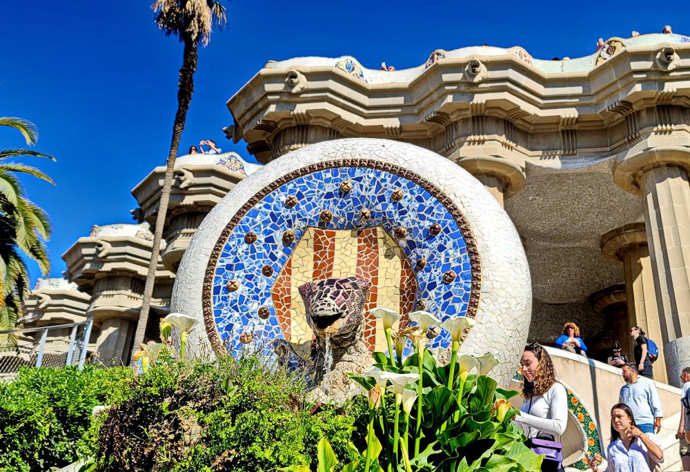 它在视觉上极为抢眼,是进入公园后的第一个吸引眼球的艺术品。它们是用陶瓷碎片拼接而成的,是高迪喜欢的“特伦卡迪斯”(trencadís)风格,即用碎片拼接创造新图案。