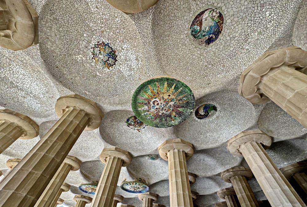 这座大厅有86根柱子,像古希腊的神庙一样支撑着上方的广场。柱子内部是中空的,有助于排水,表面装饰有螺旋和其他几何图案,增加了空间的视觉效果。天花板上有大量的彩色瓷盘和马赛克装饰,设计成太阳、星星和其他自然元素的形状。每个圆盘的颜色和图案都独一无二,让整个大厅显得神秘而丰富多彩。