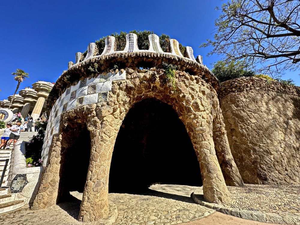 “自然回廊”,这是一个倾斜的拱形长廊,形状如同波浪。这种设计让建筑融入自然,柱子看起来像倾斜的树干或巨大的藤蔓,仿佛在支撑地面。高迪在设计步道和桥梁时,将自然融入其中,让这些结构看起来像是从地面“生长”出来的一样。曲线的设计与周围的地形相互配合,使得公园的整体布局显得既自然又和谐。