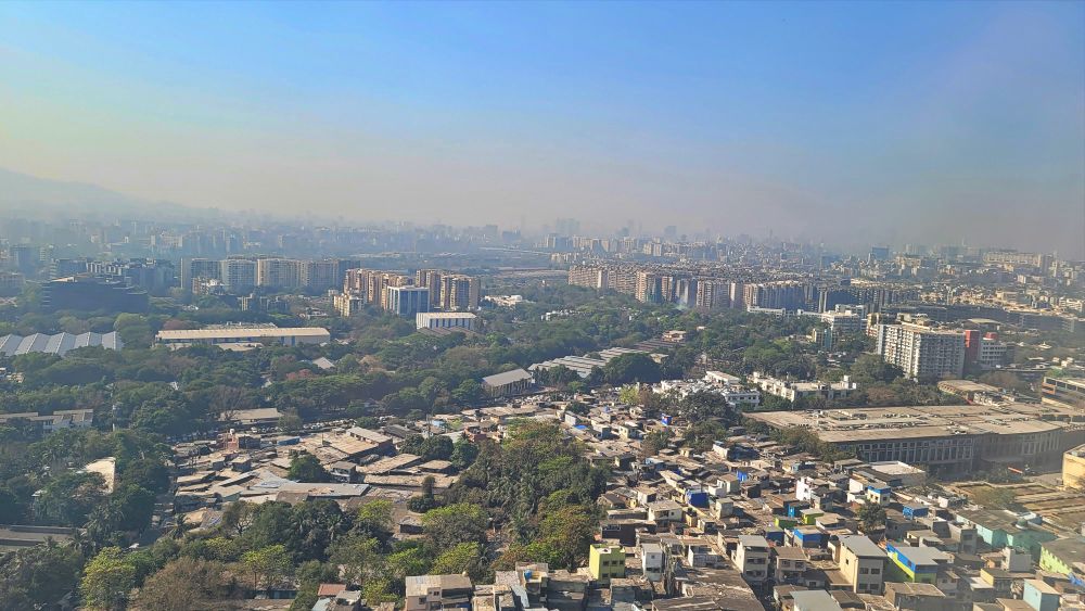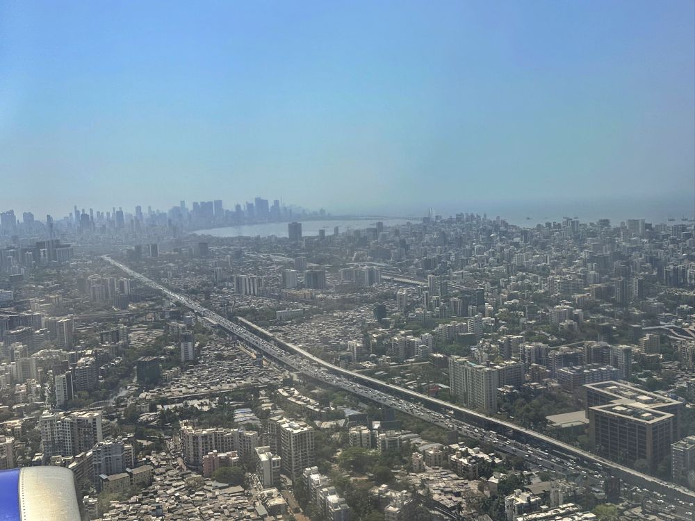 在孟买国际机场起飞后,飞机首先飞越繁忙的都市孟买,这座城市位于阿拉伯海岸边。起飞后,俯瞰下方的孟买,可看到这座大都市的高楼大厦、密集的街道和海岸线。
