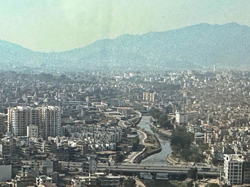 进入尼泊尔领空后,飞机开始下降,进入加德满都山谷。加德满都是尼泊尔的首都,坐落在一个环绕着山脉的盆地中。在降落过程中,由于能见度奇差(污染加天气)我们看到的加德满都谷地内的山脉,河流以及城市建筑都在一片迷雾之中。