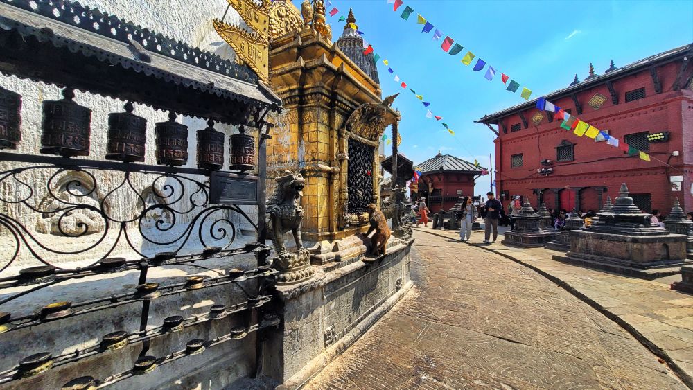 斯瓦扬布纳特寺(Swayambhunath)又称四眼天神庙,是尼泊尔的佛教寺庙,亦称斯瓦扬布佛塔,位于首都加德满都郊外斯瓦扬布山顶上。建于公元前3世纪,是亚洲较古老的佛教圣迹之一。 主建筑是一座巨型的舍利塔,塔身为圆锥型,底座为四方形,底座四面绘有眼睛的图案,这是“智慧的眼睛”,能够看到世间一切,象征着佛眼法力无边,能看着加德满都的每个角落。那里因野生猴子很多,也被人们称之为“猴庙”。久而久之,斯瓦扬布纳寺这一正式名称反而不为大众所知。