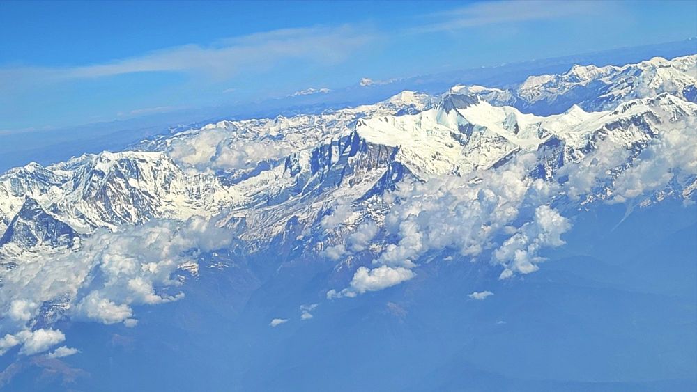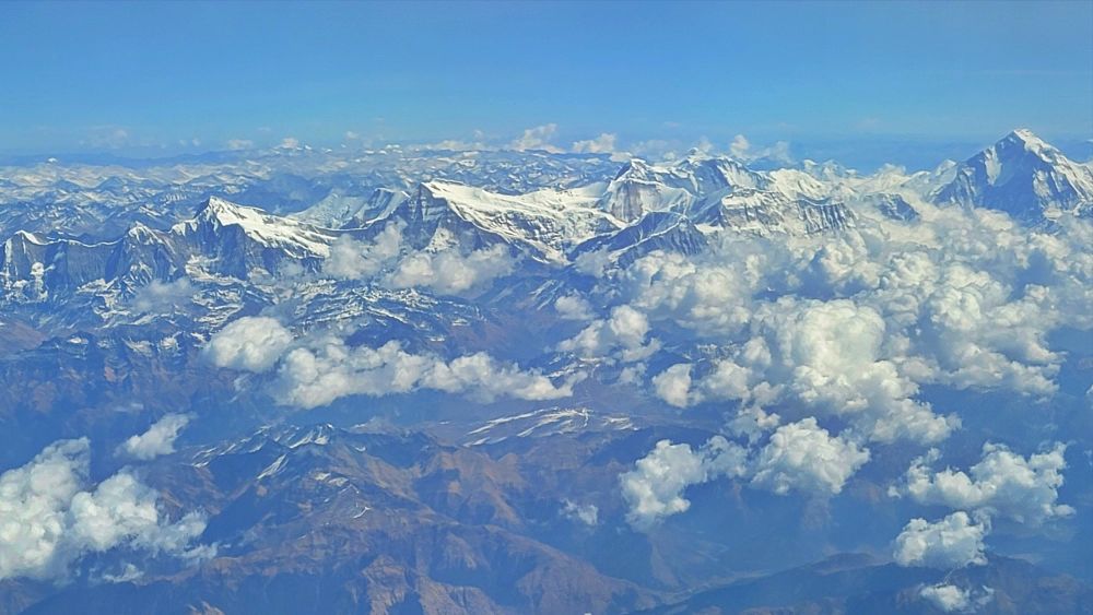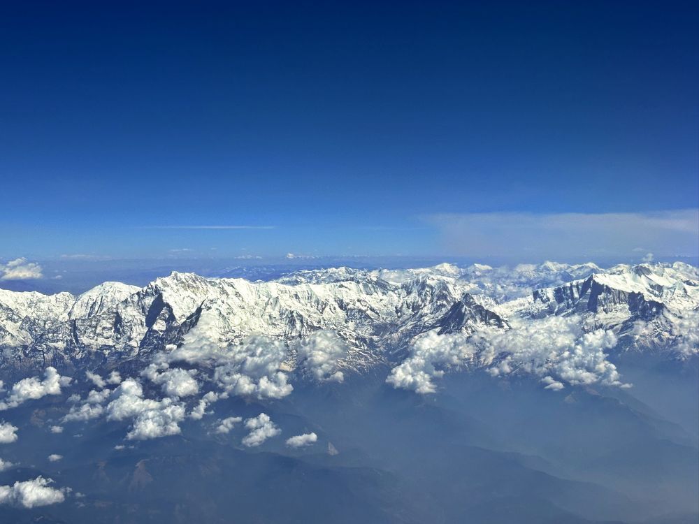 随着飞行高度的提升,连绵起伏的山脉一览无余,山谷中偶尔能看到点缀的绿洲和小村庄。西部的山峰虽然不及珠穆朗玛峰那样著名,但仍然令人叹为观止。海拔超过7000米的群峰屹立在地平线上,云层在山间缠绕,时而显露出险峻的山崖,时而隐没在雾气之中。下方则是蜿蜒的河流与谷地,仿佛大地的脉搏在此跳动。在这静谧的高空中,仿佛时间也被凝固了一般,耳畔只剩下飞机的引擎声和心中升腾的敬畏。这一瞬间,与尼泊尔的告别也带着对这片大地的深深怀念与敬重。