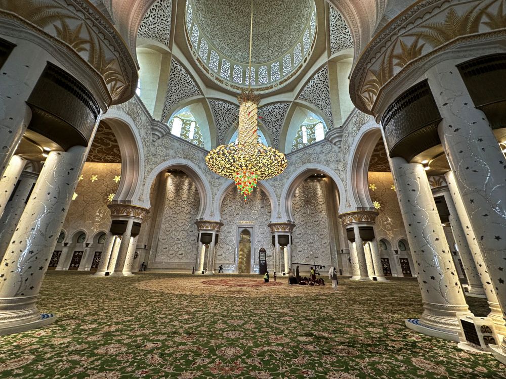 世界上最大的吊灯和地毯:清真寺的内部装饰同样豪华壮丽,七盏巨大的水晶吊灯闪耀着金色的光芒,其中主吊灯高15米,直径10米,镶有数百万颗施华洛世奇水晶。祈祷大厅中还铺有世界上最大的手工编织地毯,面积达5,627平方米,复杂的花卉图案令人叹为观止。