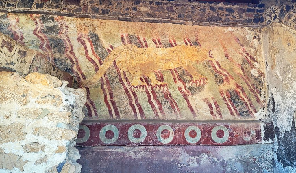 是特奥蒂瓦坎考古遗址内的一座重要宗教建筑,以其墙上的美洲虎壁画和宗教象征意义而闻名。这座神庙位于特奥蒂瓦坎的月亮广场附近,体现了这座古城在艺术和信仰上的高度发展。美洲虎神庙因其内部保存的美洲虎主题壁画而得名。这些壁画以红色、黄色和蓝色为主色调,展现了张口咆哮的美洲虎形象,常伴有羽毛和贝壳的装饰,这些元素在特奥蒂瓦坎文化中象征权力和精神世界的联系。部分壁画中还能看到美洲虎吹奏海螺的场景,可能与宗教仪式或战士的象征有关。