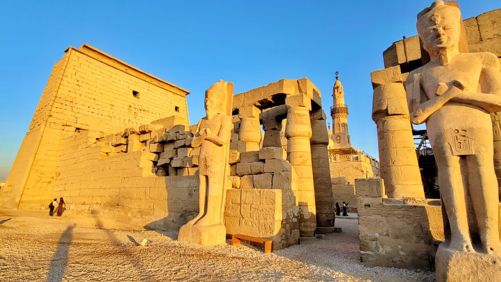 拉美西斯二世的巨像,背景中还可以看到阿布哈贾格清真寺的宣礼塔。
