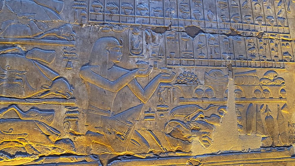 墙壁浮雕描绘了法老亚历山大大帝向阿蒙神献祭的场景