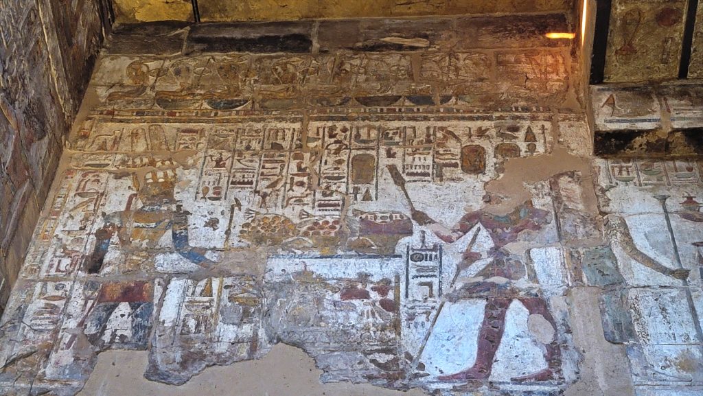 第二庭院东墙的彩色浮雕展现拉美西斯三世向敏卡穆提夫献香与奠酒。