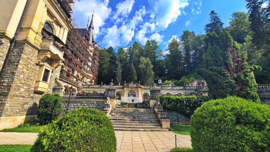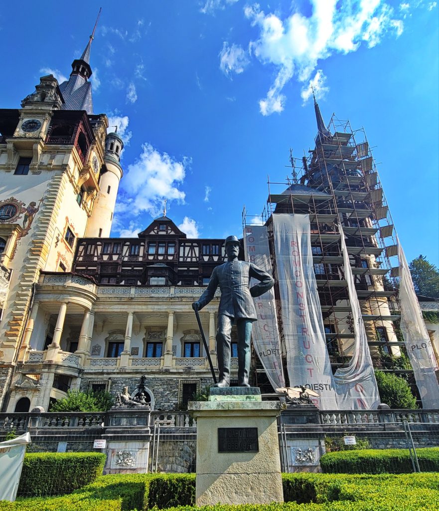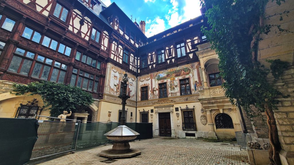 城堡内部庭院,由于正在修缮,很可惜,我们与内部参观无缘。据说它是欧洲最“现代”的王宫之一,城堡1883年落成时,已配备电力系统、中央供暖、电话和电梯,在当时的欧洲王宫中极为罕见。城堡使用的是自建水电站,比布加勒斯特许多街区通电还早。城堡内有160多个房间,装饰风格各不相同:德意志新文艺复兴、意大利文艺复兴、摩尔式、西班牙风格并存。