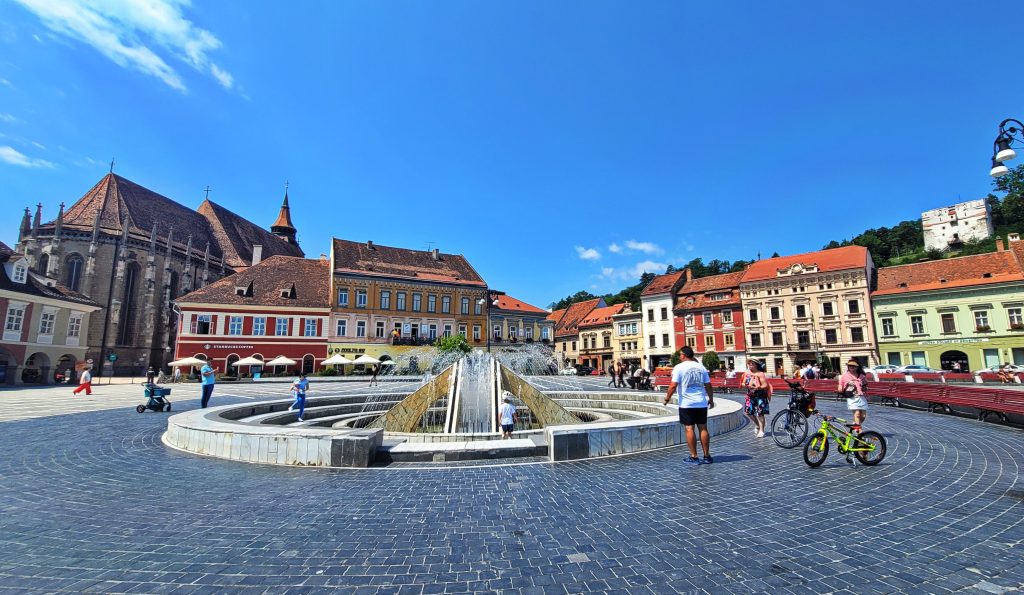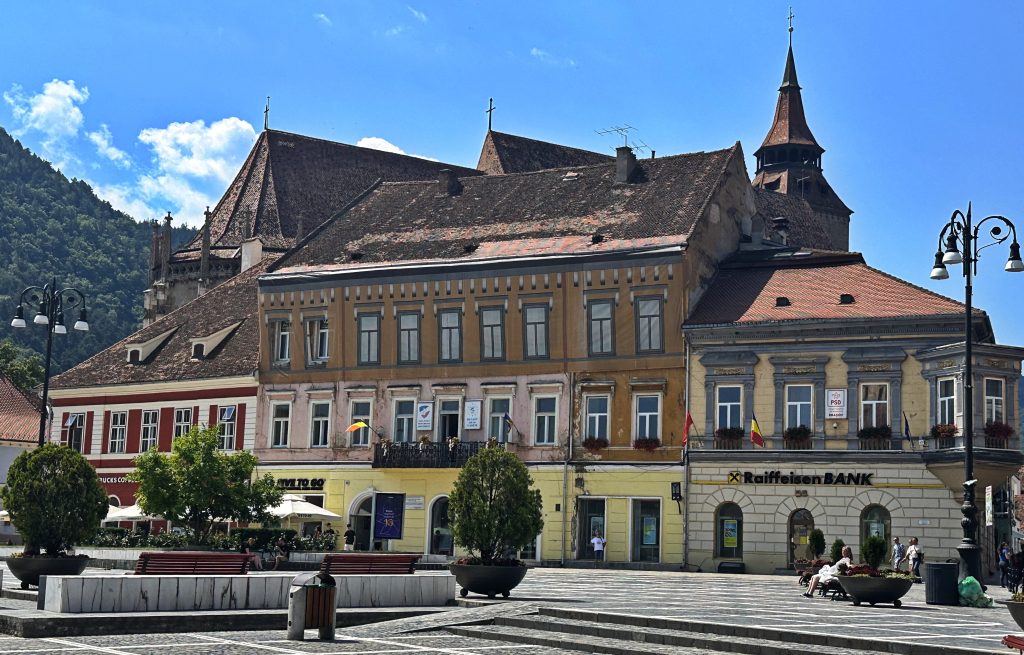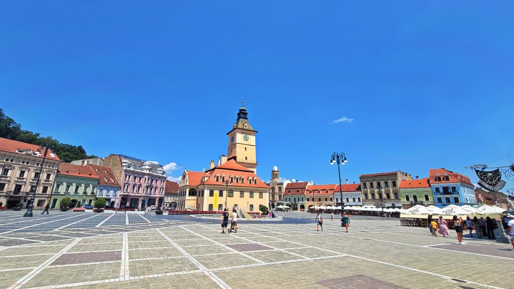 布拉索夫议会广场位于老城中心,周围环绕着彩色巴洛克与哥特式建筑。背景左侧是著名的黑教堂(Biserica Neagra)